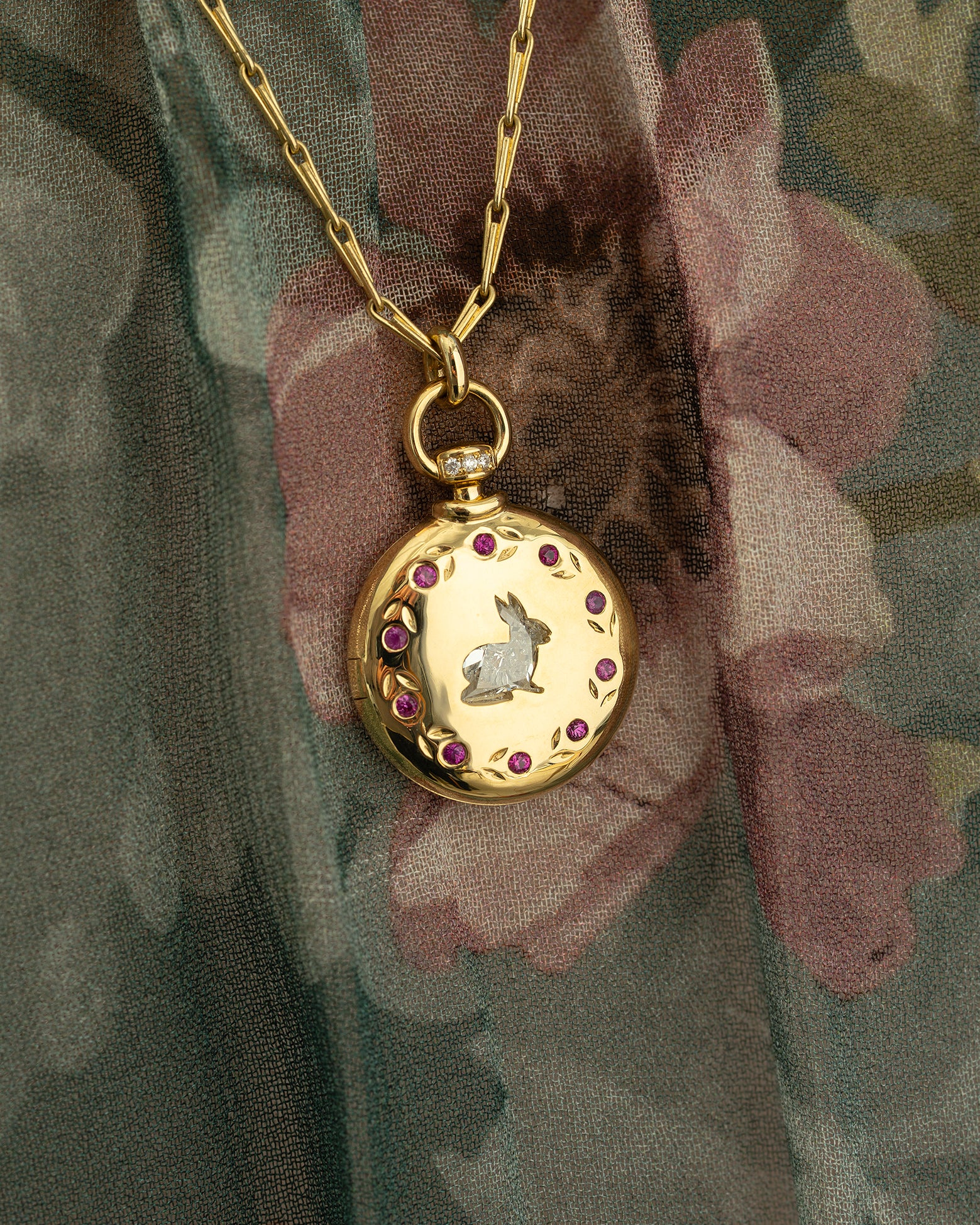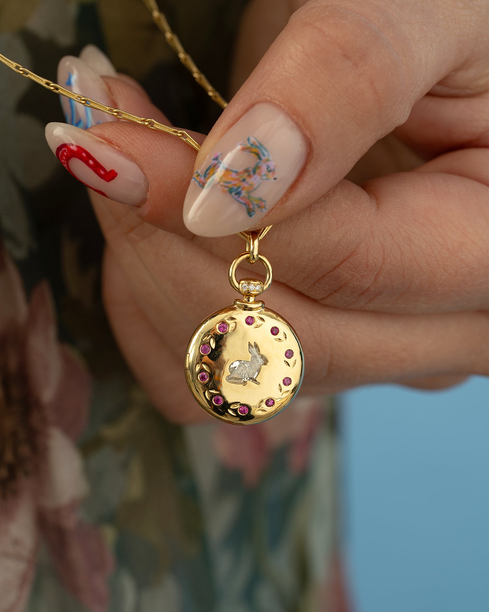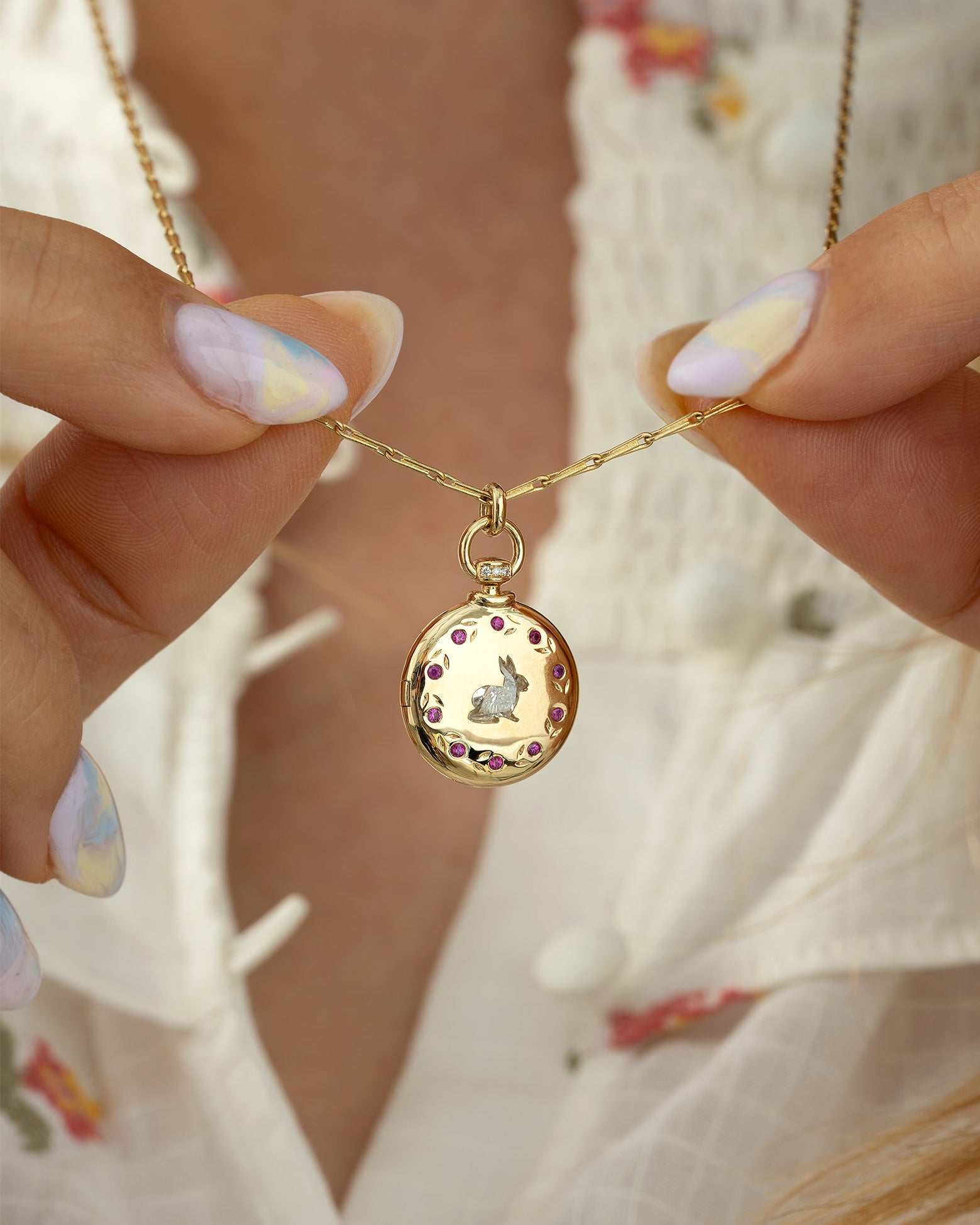 The Gold Locket Necklace with Rabbit Shaped Diamond & Pink Sapphire Florals is a locket designed to feel both nostalgic and magical. Set in 18K gold, a rabbit-shaped diamond rests within a wreath of pink sapphire flowers with hand-engraved leaves. A diamond-accented bail crowns the piece, while a heart-shaped cutout on the back and a tiny hidden diamond inside add sweet, unexpected details. This little storybook treasure keeps a token of your loved one close to the heart.