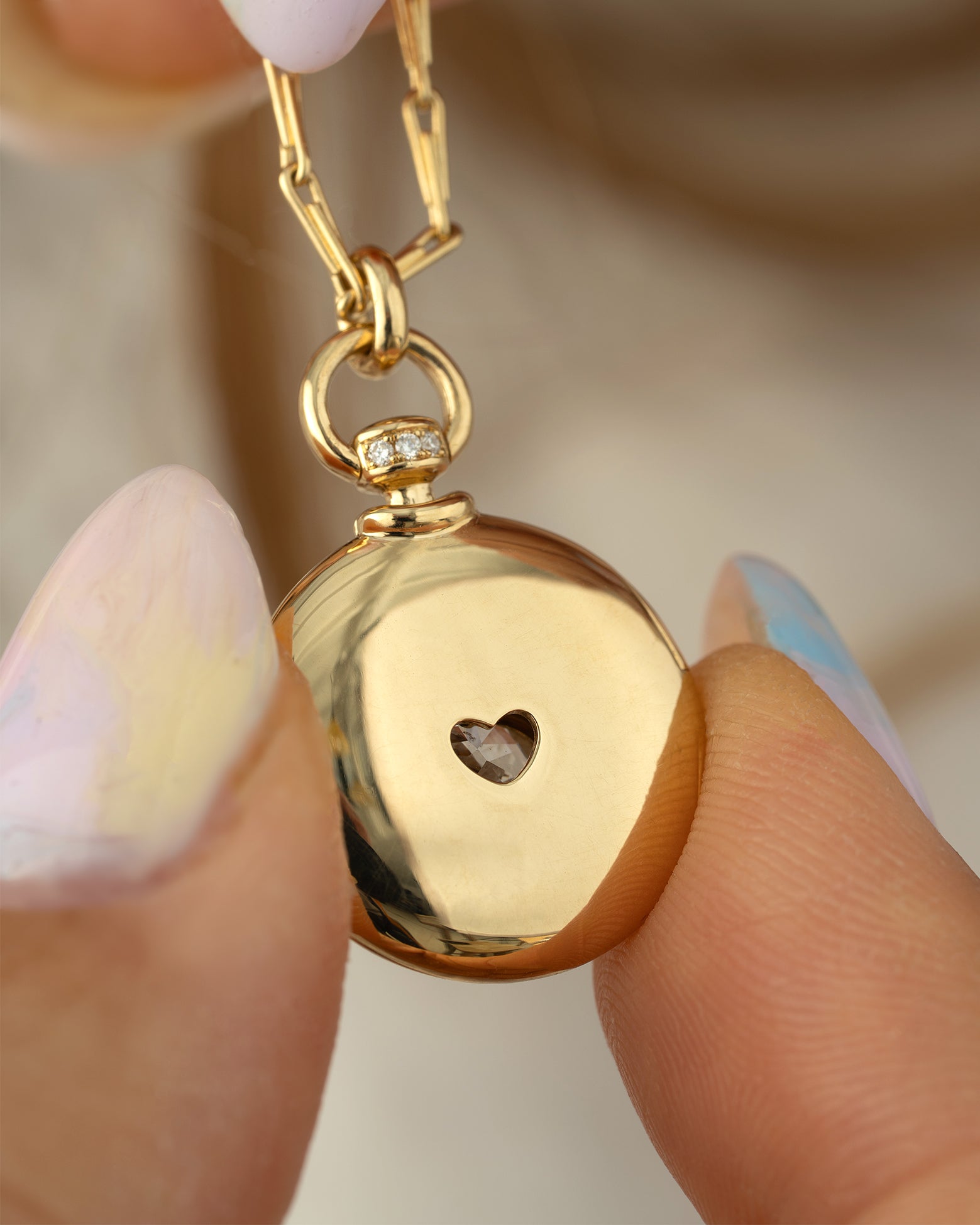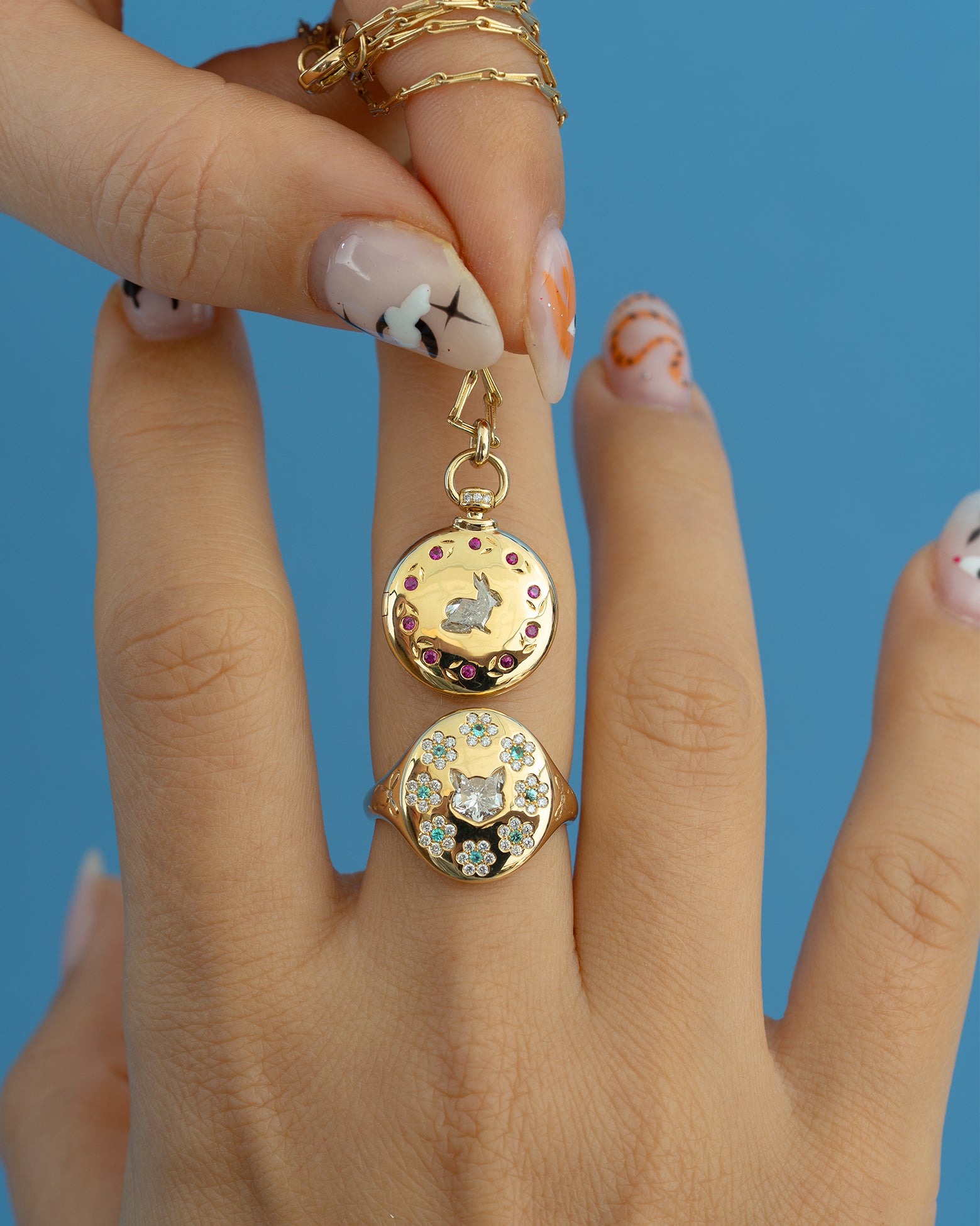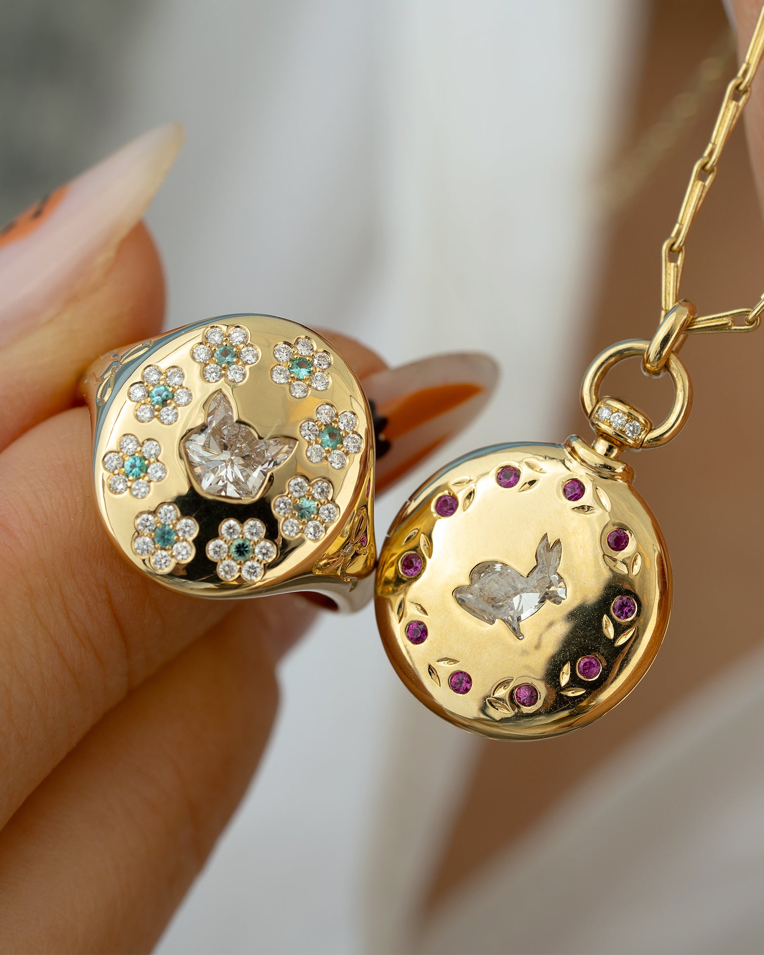The Gold Locket Necklace with Rabbit Shaped Diamond & Pink Sapphire Florals is a locket designed to feel both nostalgic and magical. Set in 18K gold, a rabbit-shaped diamond rests within a wreath of pink sapphire flowers with hand-engraved leaves. A diamond-accented bail crowns the piece, while a heart-shaped cutout on the back and a tiny hidden diamond inside add sweet, unexpected details. This little storybook treasure keeps a token of your loved one close to the heart.