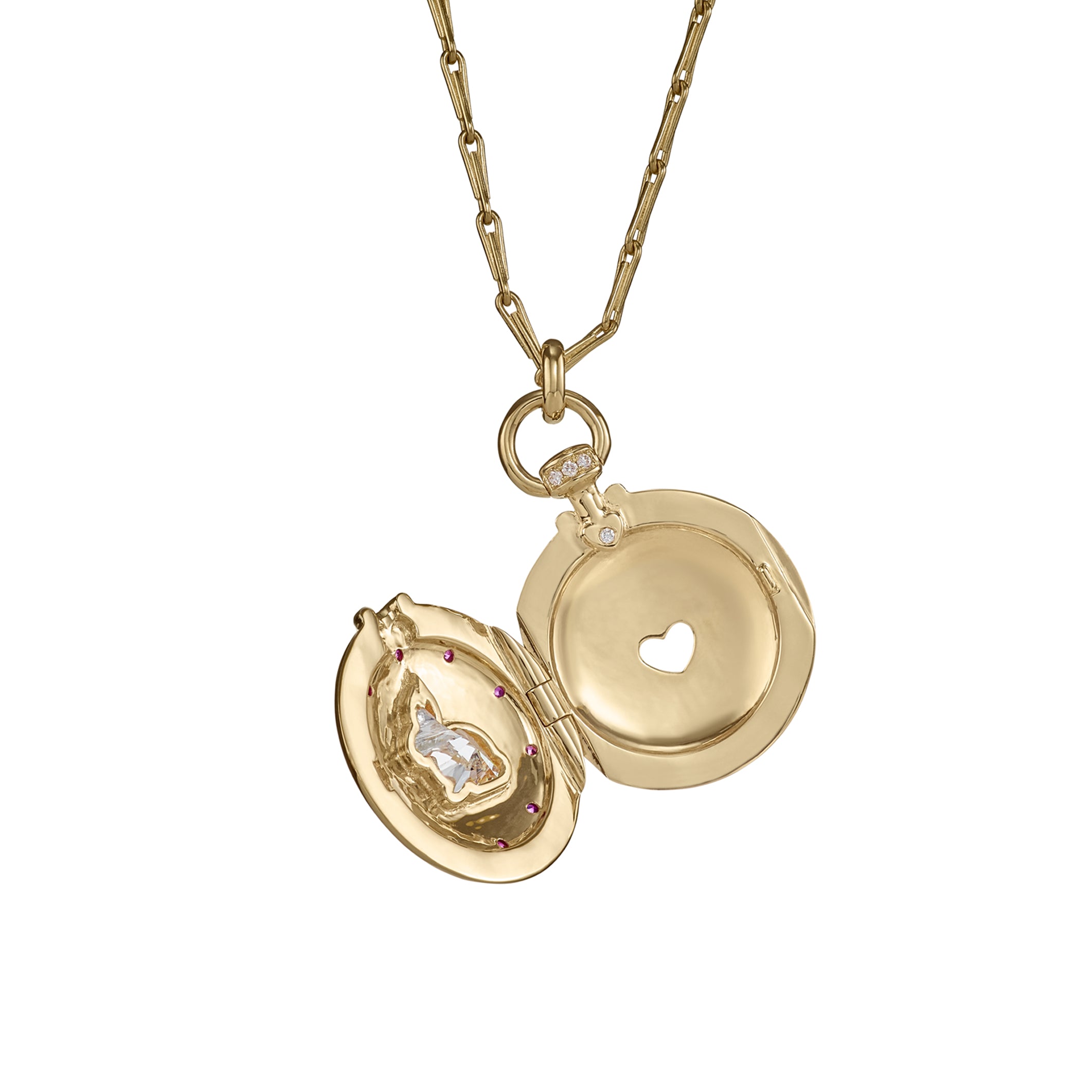 Gold Locket Necklace with Rabbit Shaped Diamond & Pink Sapphire Florals