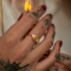 The Golden Hour orange parti sapphire and diamond ring is a one-of-a-kind piece. Handcrafted from 18 karat gold, a glowing ~1.5ct parti sapphire in warm amber and saffron tones takes center stage. A delicate tapered baguette diamond and trillion cut diamond accent each side. This unique design is a radiant addition to any collection.