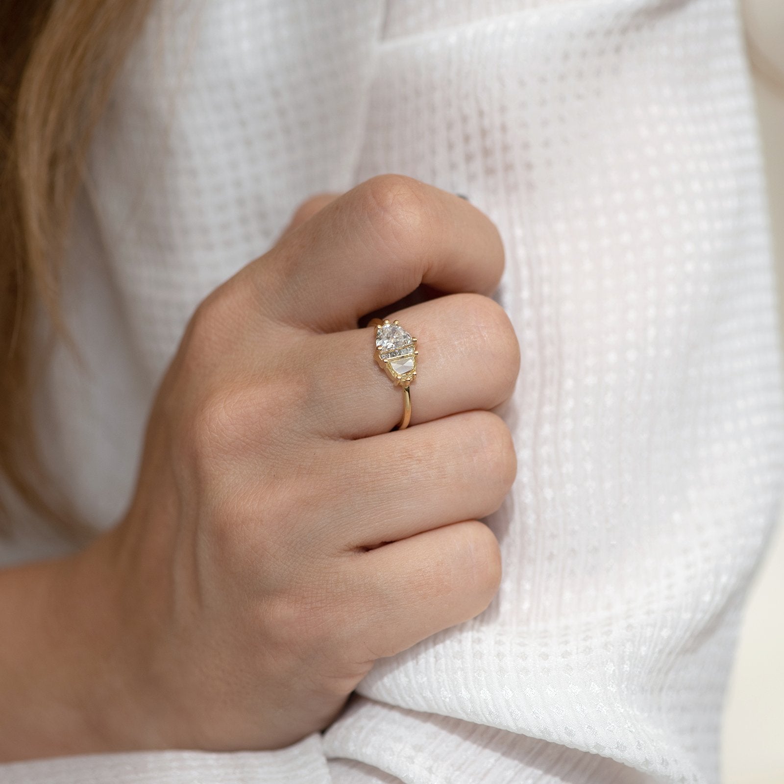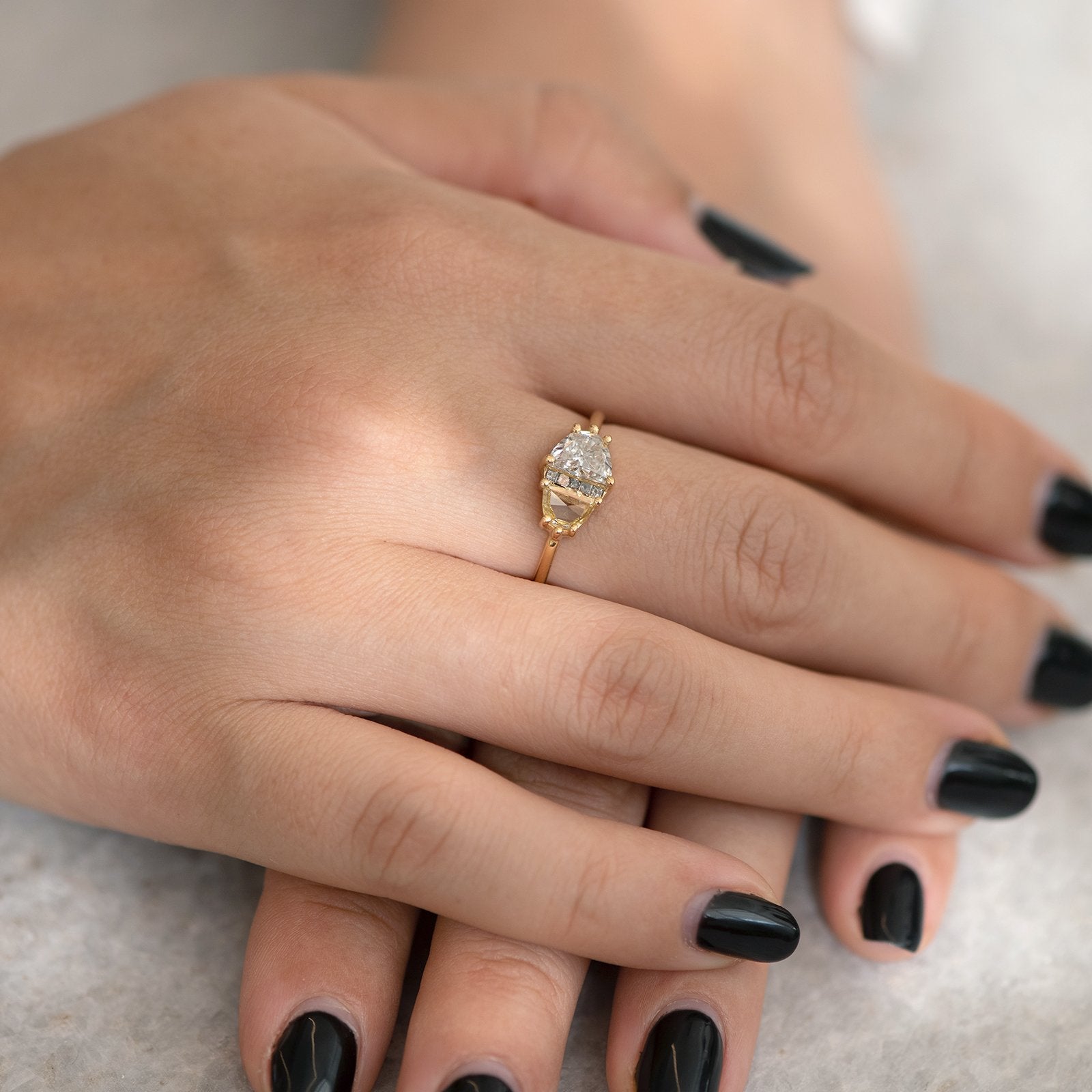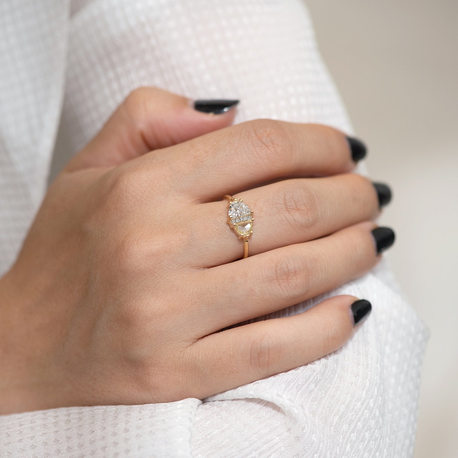 Half Moon Cut Engagement Ring with White, Yellow and Grey Diamonds