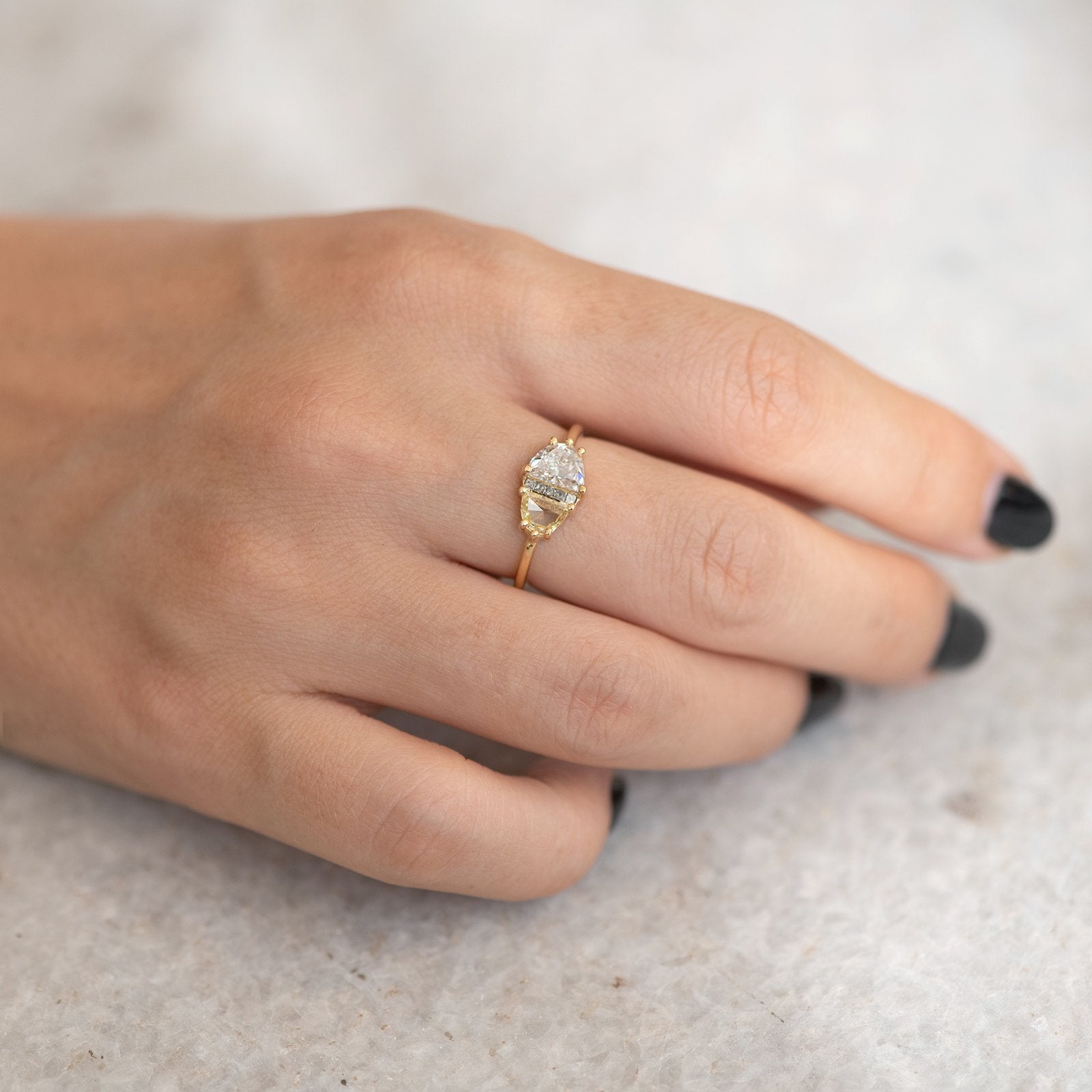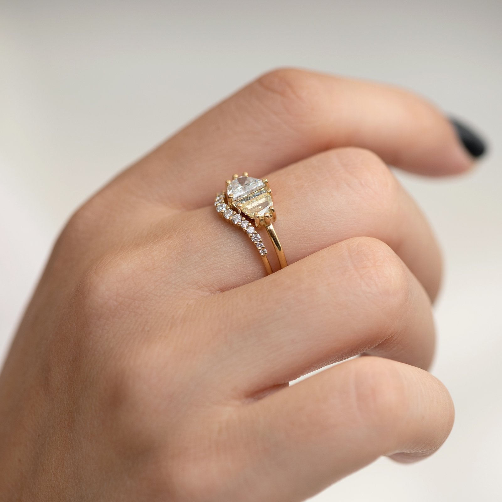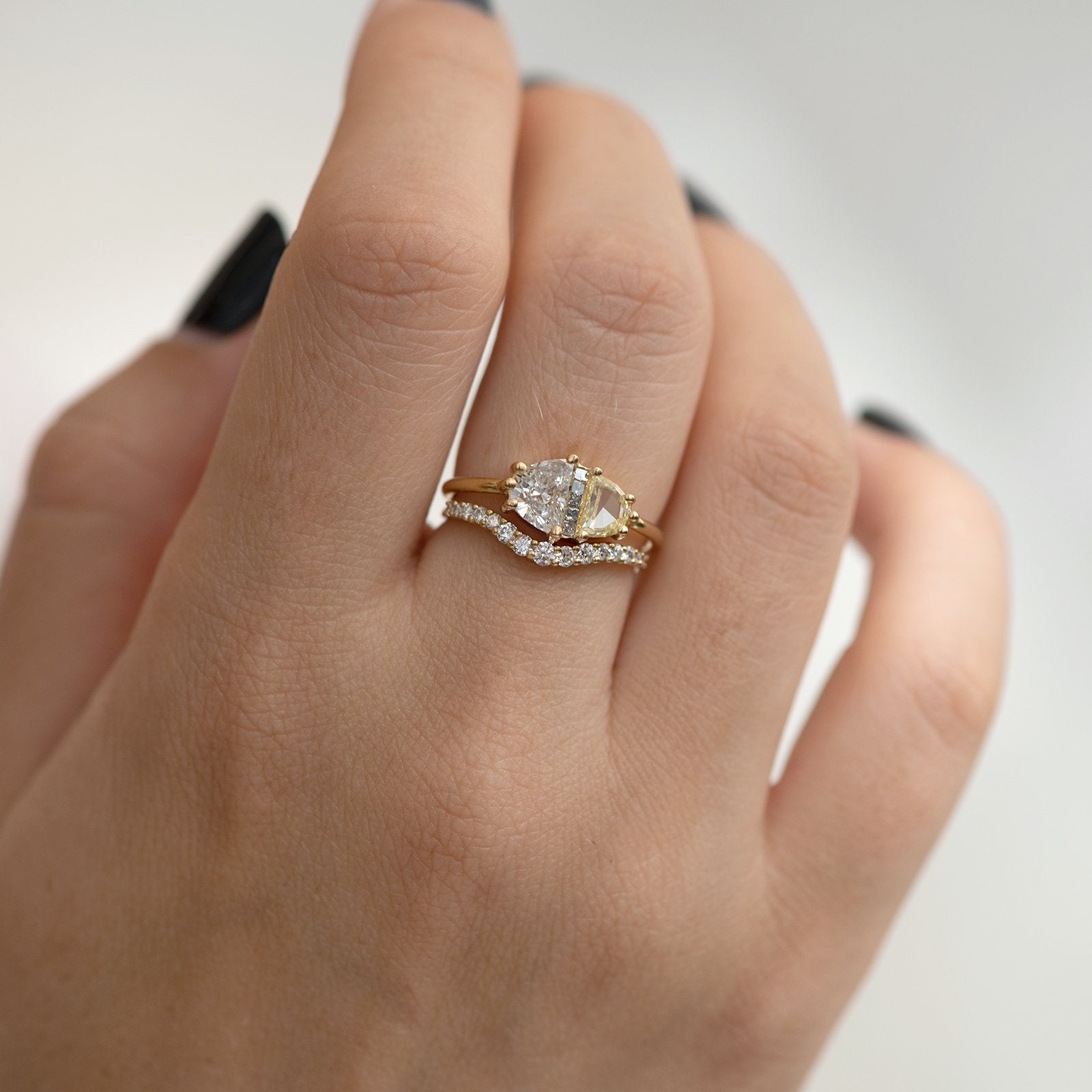 18k solid yellow gold | 0.7-0.78 carat white half-moon diamond | yellow half-moon slice diamond | five 1.3mm grey princess cut diamonds
