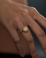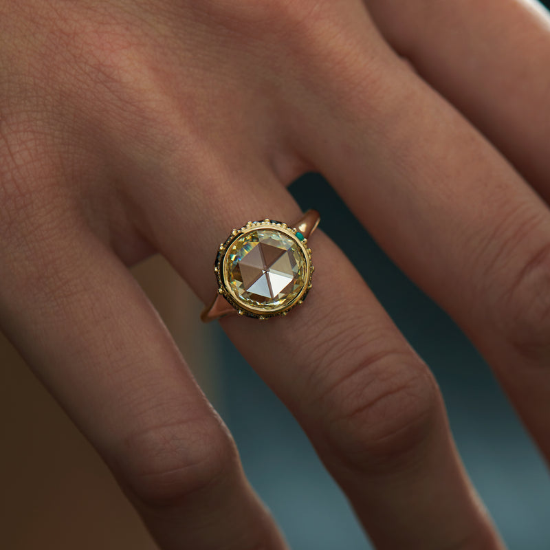 The Hathi rose cut black diamond and turquoise engagement ring is inspired by the  majestic elegance of elephants. Crafted from 18K, black marquise diamonds surround a fancy yellow rose cut diamond with single turquoise accent on one side of the ring.  Fine gold milgrain detailing adds further dimension to this design.