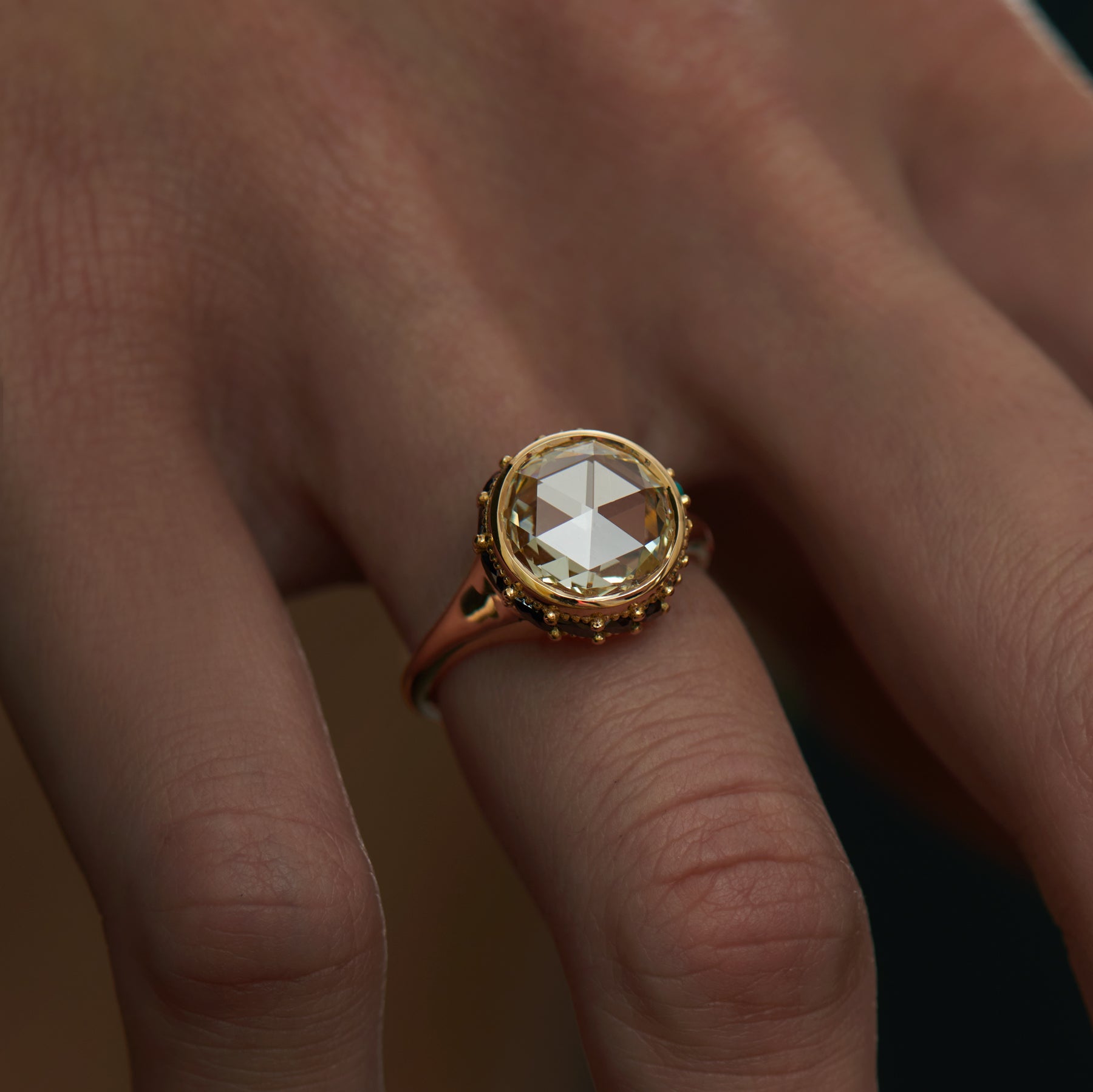 18K solid gold | Rose cut natural fancy yellow diamond | Marquise cut black diamonds | Turquoise