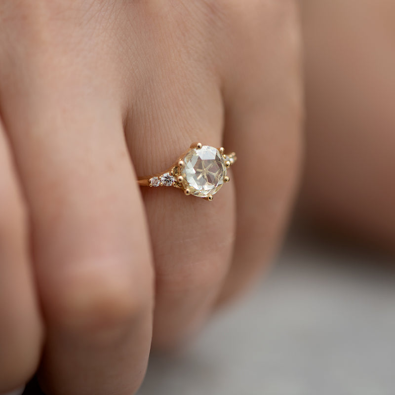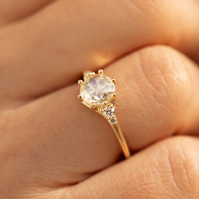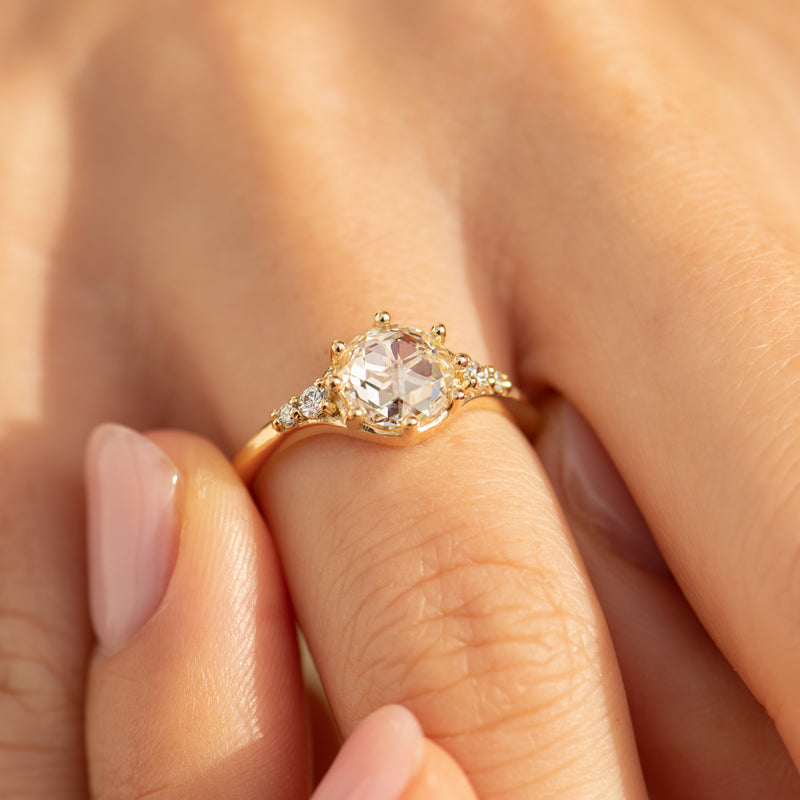 18k solid gold | 1.2-2.25 carat rose cut diamond | two 2mm round brilliant diamonds | two 1.5mm round brilliant diamonds