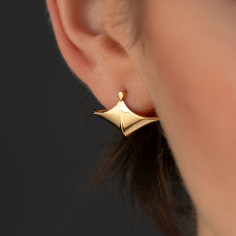 The Modern 18K Gold Pointed Wide Huggie Earrings are handcrafted in our studio from 18K gold. Smooth, polished gold fans out wide, encasing the ear giving the appearance it's made of gold with a tipped point at the end for touch of edge.