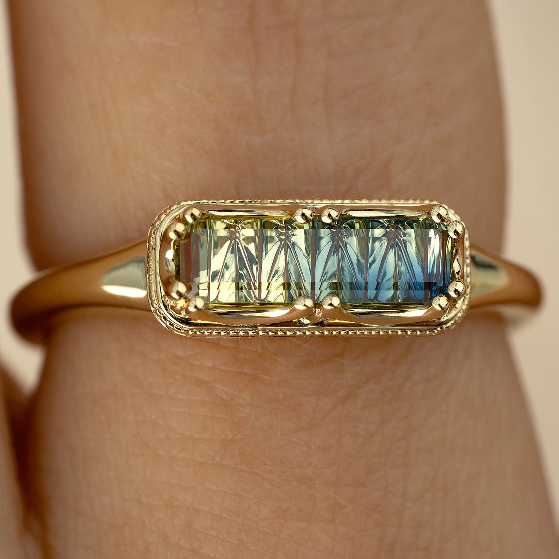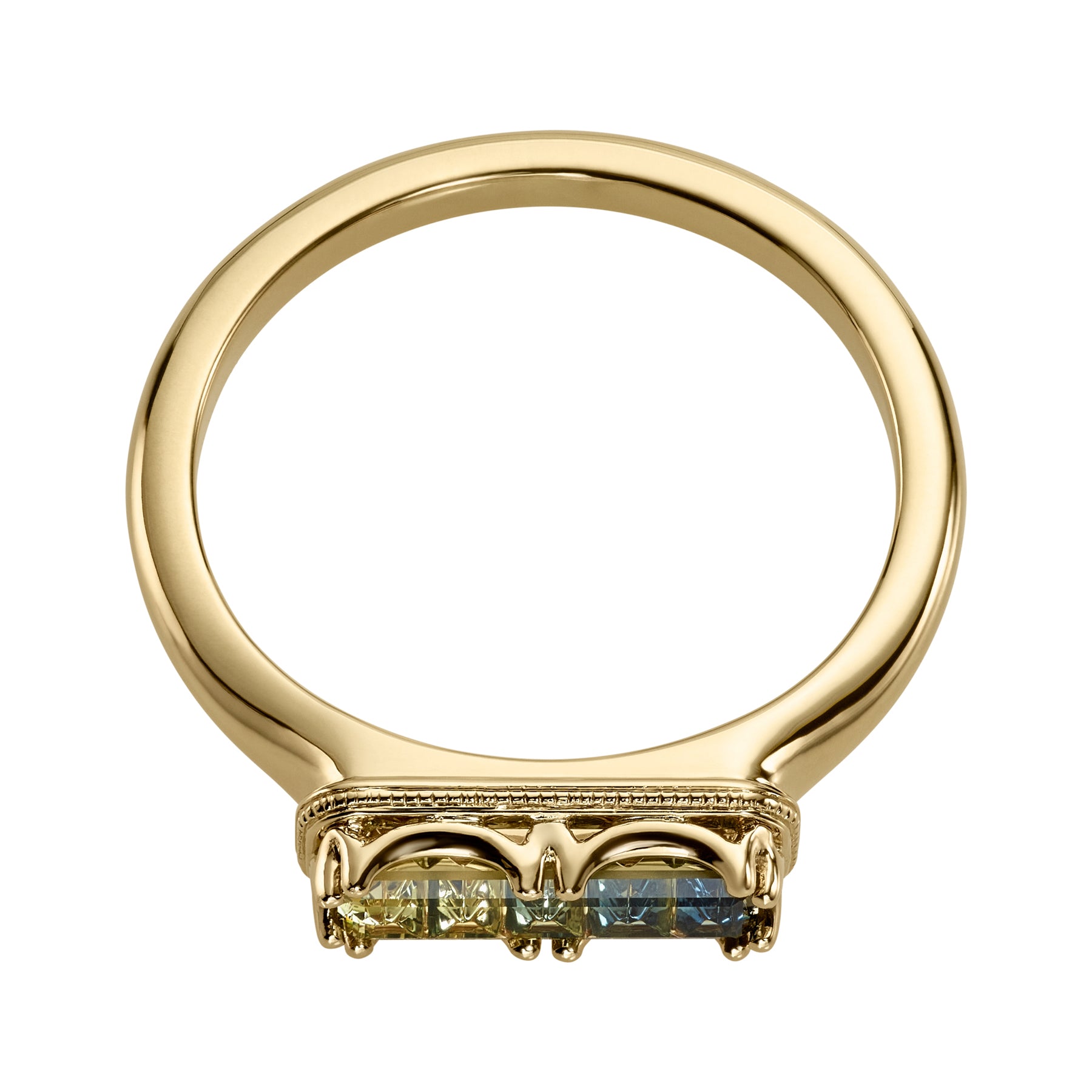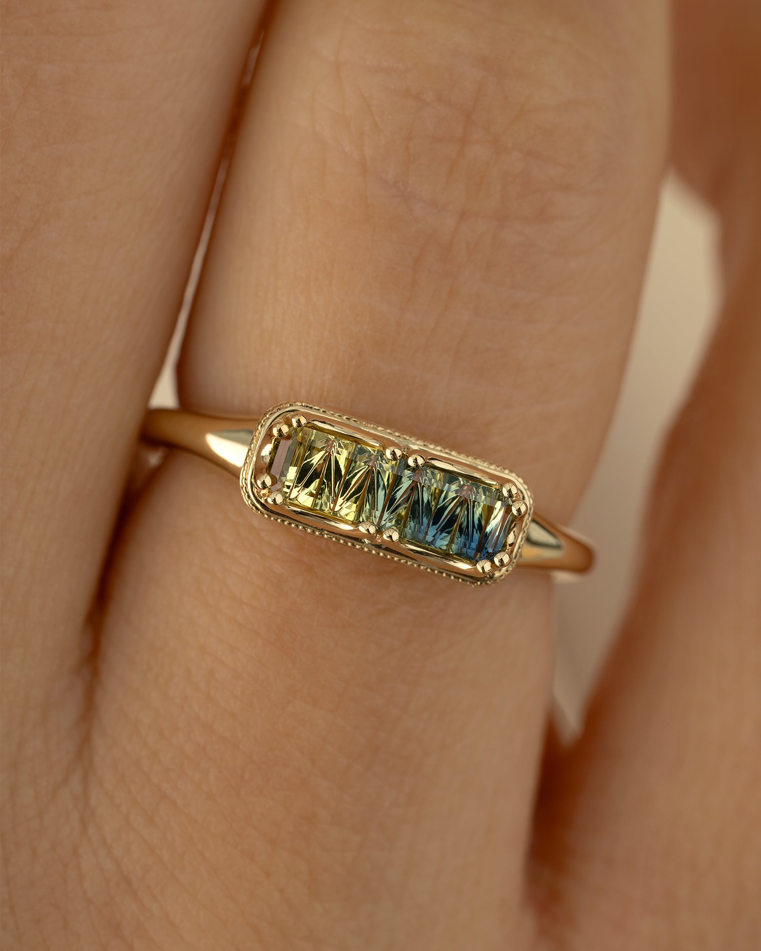 The OOAK Novelty Cut Parti Sapphire Ring with Milgrain Detail is hand handcrafted in our studio from 18K gold. This design features a one-of-a-kind parti sapphire in a unique zigzag-like cut. Delicate gold milgrain accents around the stone add an extra special touch.