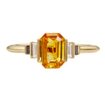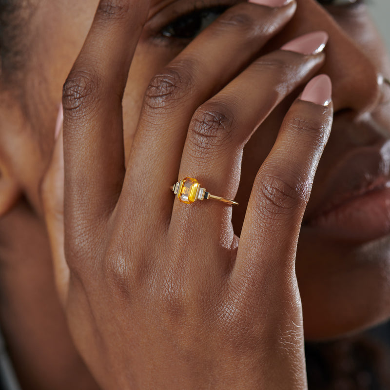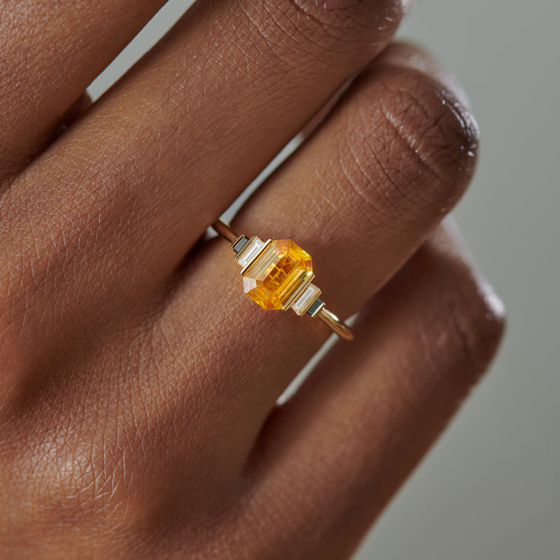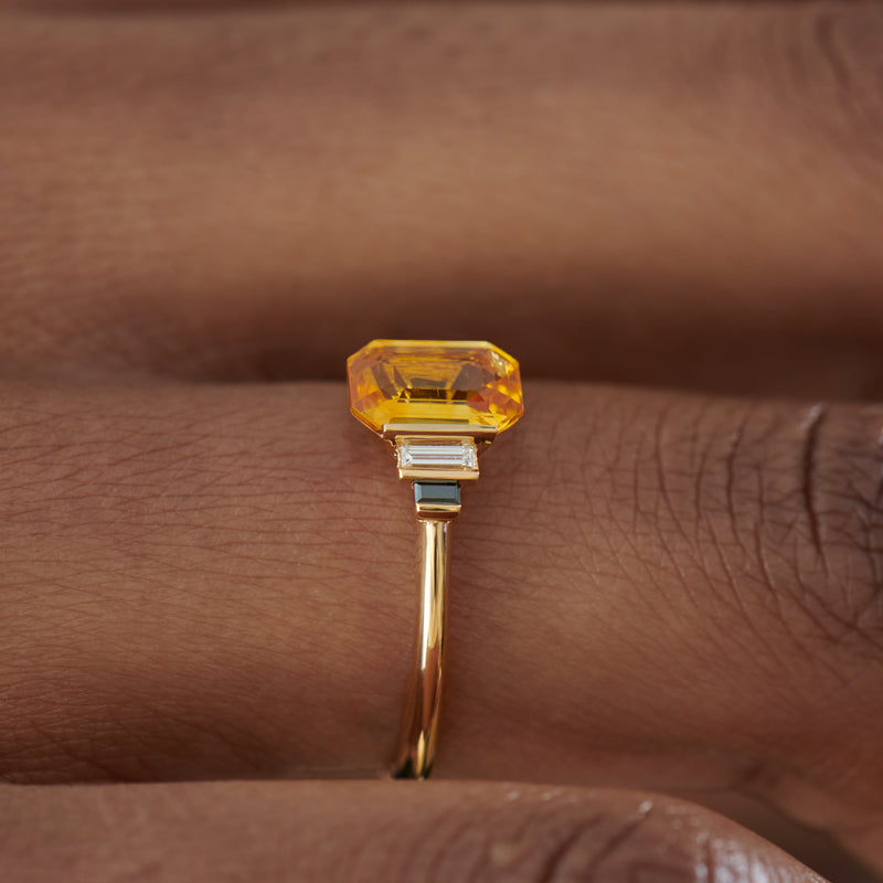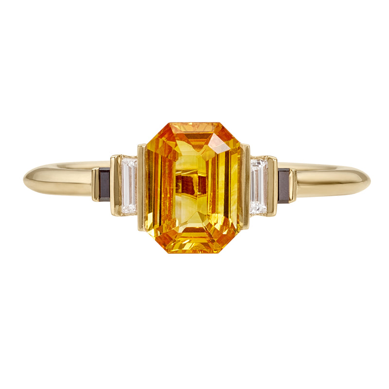 18k solid gold | Emerald cut orange sapphire | White baguette diamonds | Black baguette diamonds