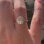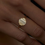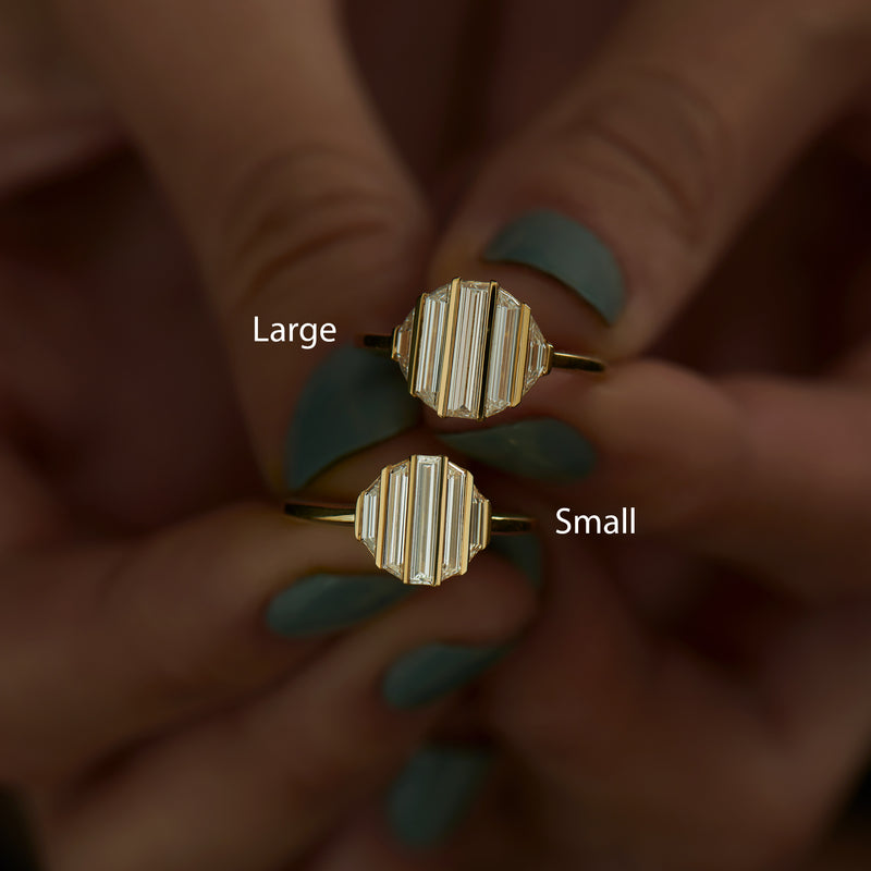 The Ripple baguette & trapeze diamond engagement ring is crafted from 18K gold. In this design, baguette and trapeze diamonds are divided by gold bar accents adding a warm, glistening touch. This piece is a sleek and modern addition to any ring set.