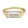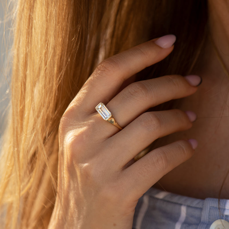 The Solitaire Signet Engagement Ring with an Emerald Cut Diamond effortlessly combines our passions of simplicity, craftsmanship, and design. This design is set with an emerald cut white diamond that is modernly oriented in the east/west direction, and is carefully set into a polished golden band.